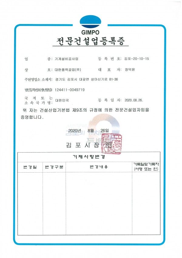 전문건설등록증 페이지 정보 작성자최고관리자 댓글 0건 조회Hit 1,130회 작성일Date 20-08-31 17:58 본문 전문건설등록증 목록 이전글스마트공장 ( Smart Factory ) 확인서 20.09.02 다음글직접생산확인증명서 20.06.30
